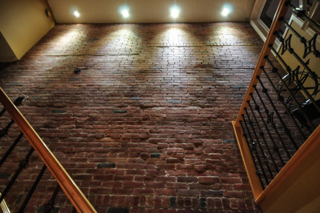Ici, le client désirait un mur de briques ancien. Nous sommes dans une copropriété de la haute-ville de Québec. Le mur en question a une hauteur de 22 pieds. J'y ai installé des insertions de vieilles pièces de bois. J'ai aussi créé une certaine irrégularité dans le relief de la surface.